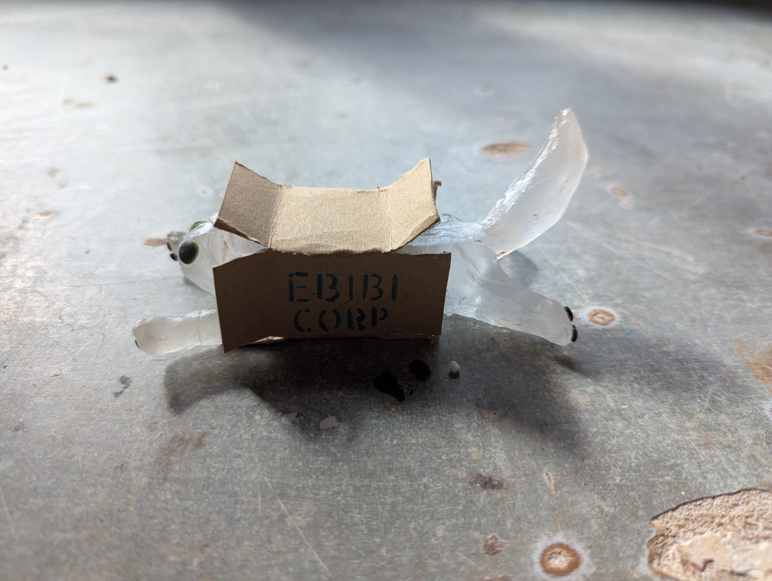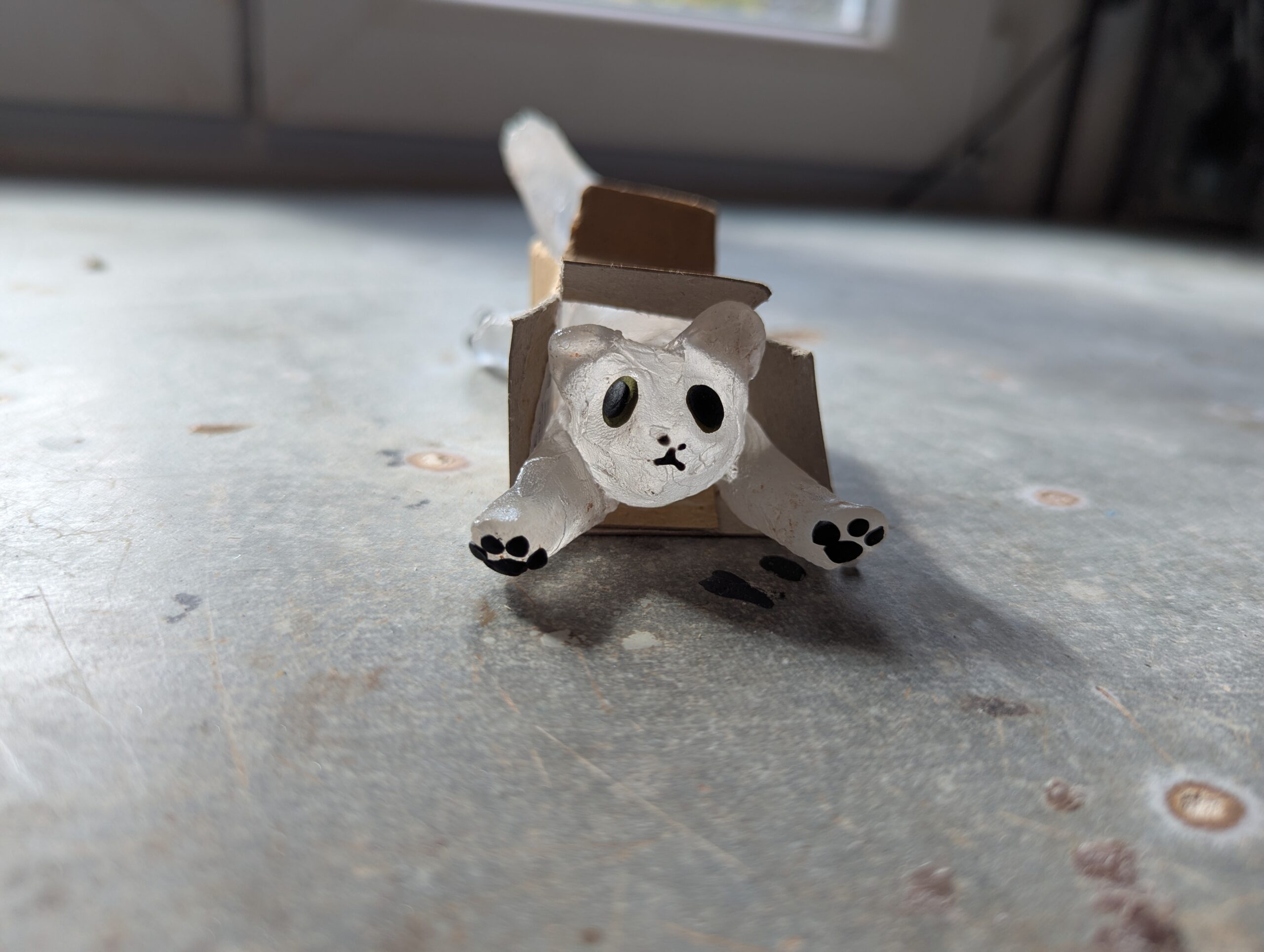 Petit chat en verre dans son milieu naturel (carton) qui saura veiller sur vos étagères.