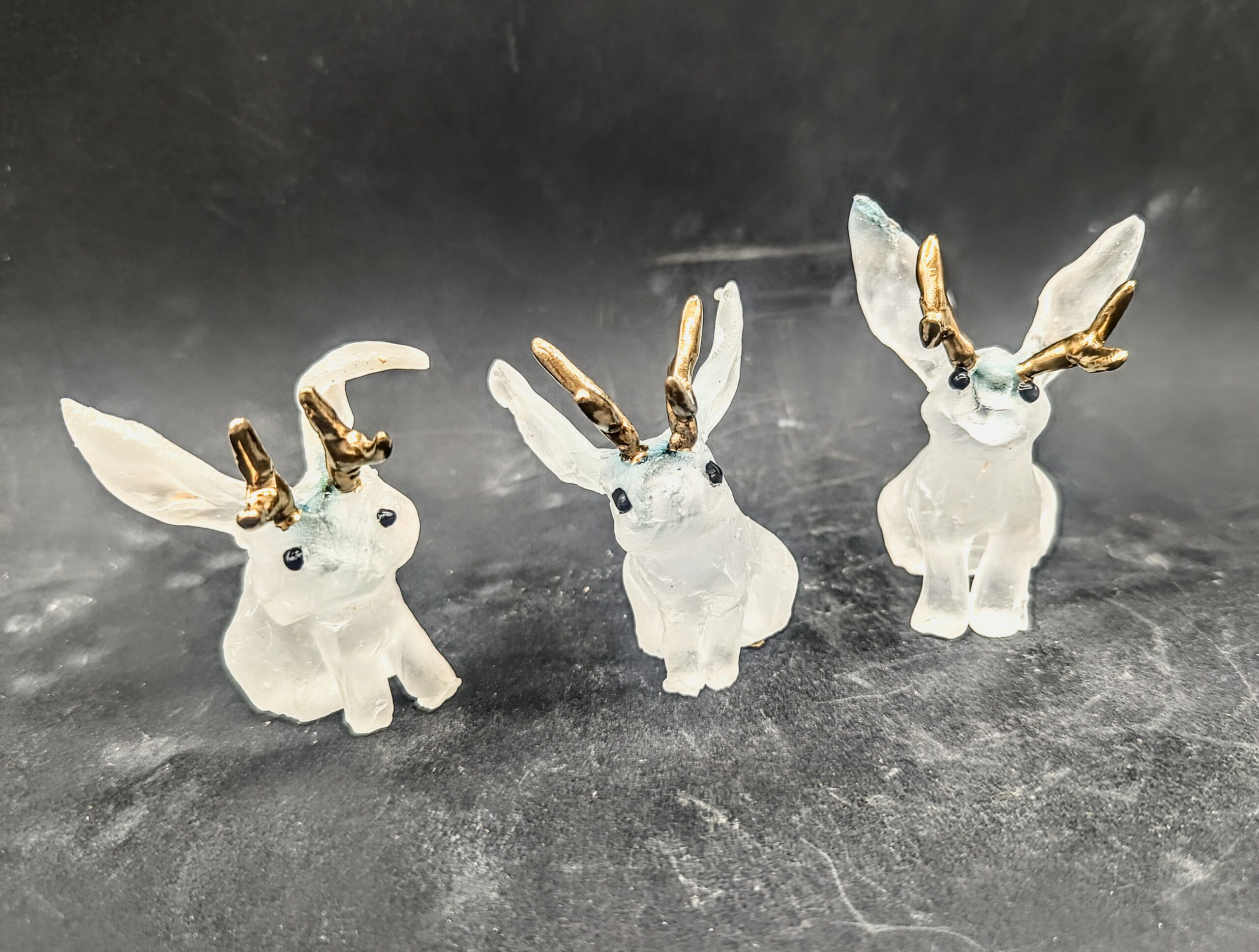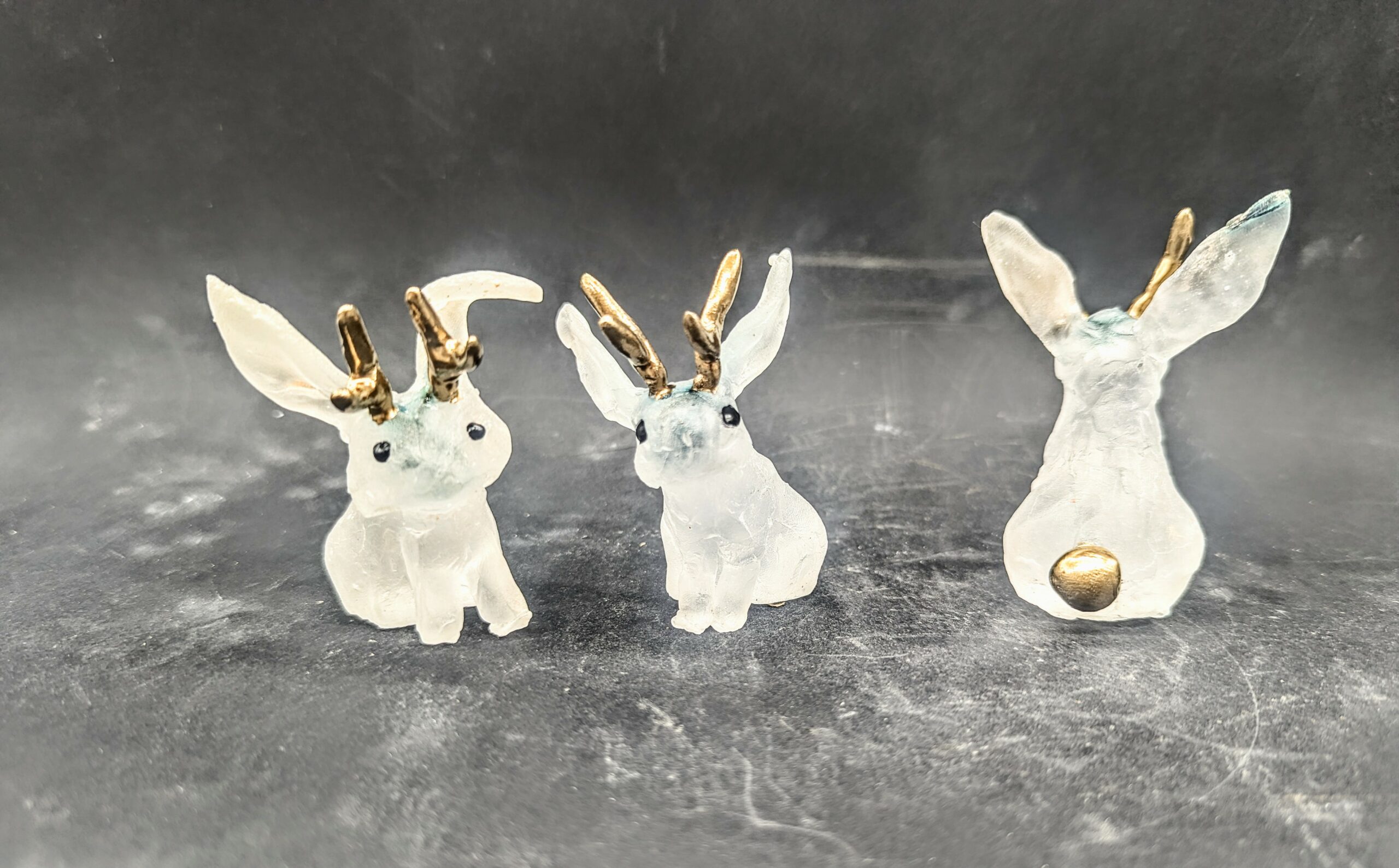 Petit lapin avec des bois en argile époxu peinte en dorées, pièce unique en verre