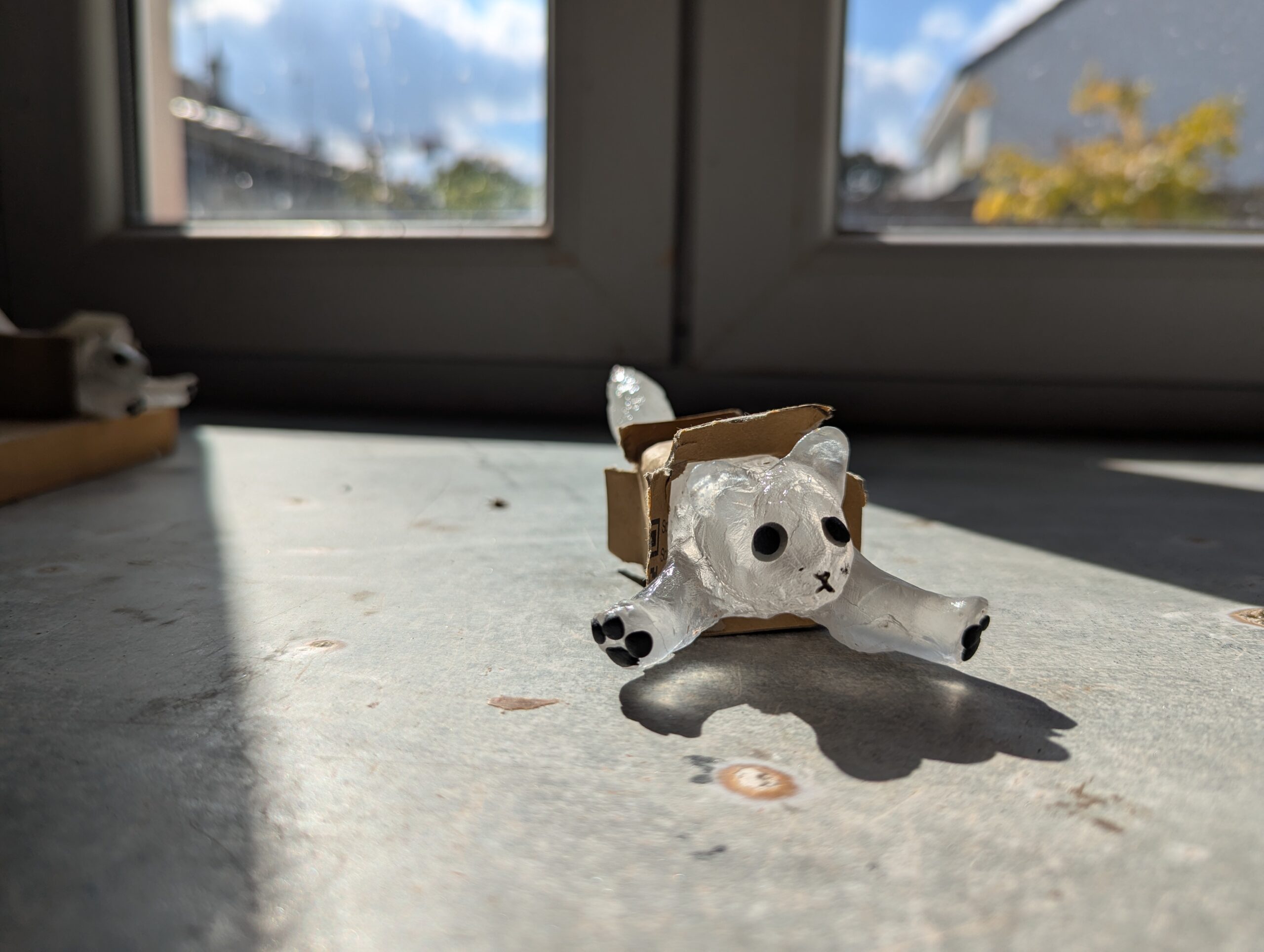 Petit chat en verre dans son milieu naturel (carton) qui saura veiller sur vos étagères.